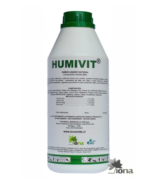 Humivit, aporta hormonas auxinas, giberelinas, microelementos, N, P, K, ácidos húmicos y fúlvicos, vitaminas, sustancias proteicas, humatos y aminoácidos.